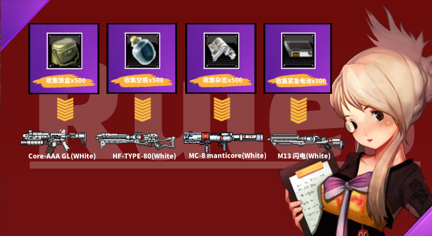 玩家可通过游玩,包括(任务模式,合作模式,)等游戏模式随机掉落 饭盒 空瓶 杂志 紧急电池 等物品, 集齐一定数量后 方可兑换终极WHITE武器!WHITE武器不再复卖,永久收藏!