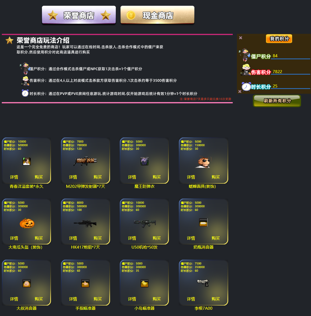 玩家可以通过 游戏击杀敌人 击杀僵尸,在线游戏时间,获取积分,积分可以兑换各种精品武器道具